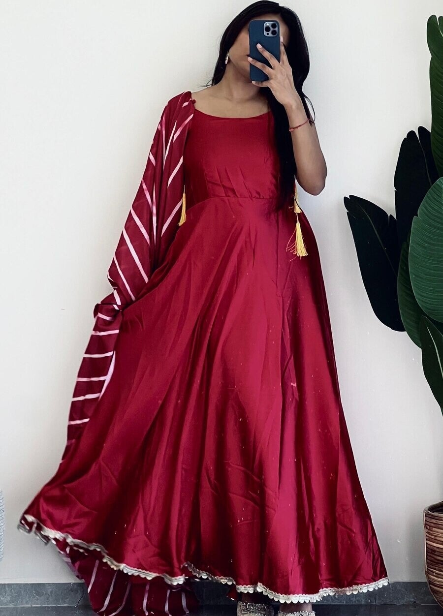 RICH LOOK JAPAN SILK FANCY LACE BORDER WORK ANARKALI GOWN WITH DUPATTA MAROON