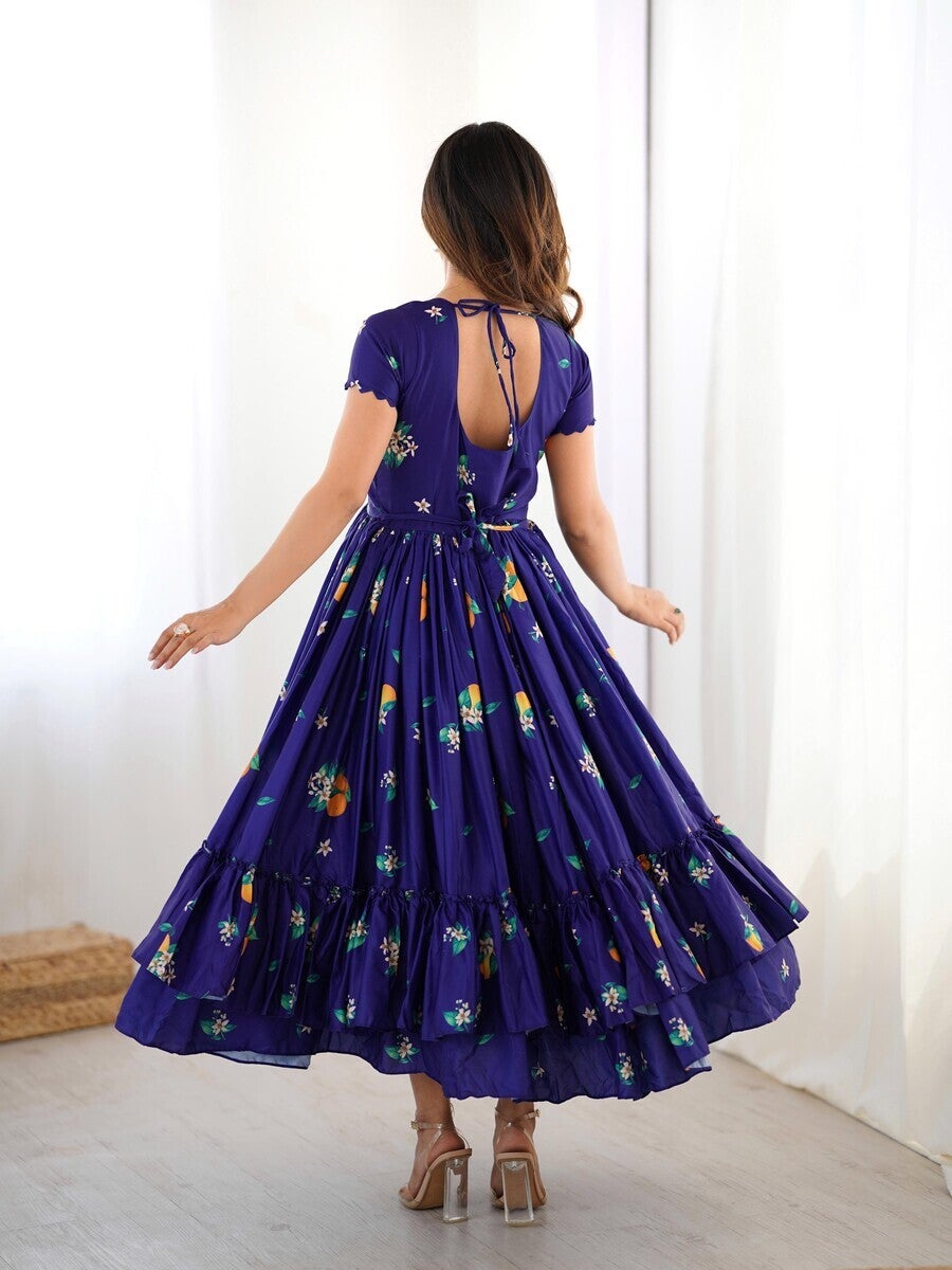 FANCY MUSLIN SILK FLORAL PRINTED AND BOTTOM SIDE DUBLE FRILL WORK ONE PIECE DRESS PURPLE